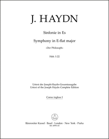 **Title**: Symphony in E-flat major Hob. I:22 "Der Philosoph" | **Comments on Version**: Urtext from the G. Henle Complete Edition of the "Works of Joseph Haydn" | **Composer / Author**: Haydn, Joseph | **Editor**: Walter, Horst | **Edition Type**: Wind set, Urtext edition | **Scoring/ Instrumentation**: Cors anglais (2), Horns (2) | **Binding**: Stapled | **Weight**: 72.0 g | **Format**: 32,5 x 25,5 cm | **Pages**: 4/4/4/4 S. | **Language**: EN | Sample: https://data.baerenreiter.com/NB/BA/BA10991_65_9790006577507_nb_lrg_01.jpg