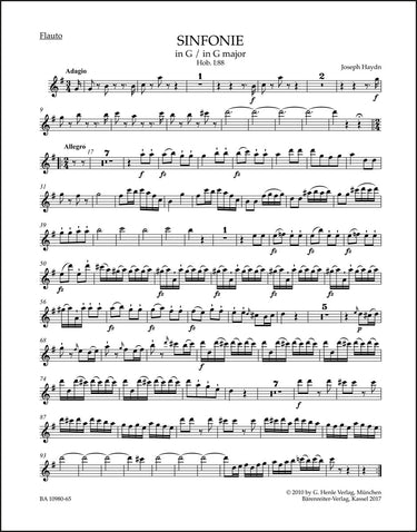 **Title**: Symphony in G major Hob. I:88 | **Comments on Version**: Urtext from the Henle Complete Edition of the Works of Joseph Haydn | **Composer / Author**: Haydn, Joseph | **Editor**: Friesenhagen, Andreas | **Edition Type**: Wind set, Urtext edition | **Scoring/ Instrumentation**: Flute, 1. Oboe, 1. Oboe, 1. Bassoon, 2. Bassoon, 1. Horn, 2. Horn, 1. Trumpet, 2. Trumpet, Timpani | **Binding**: Stapled | **Weight**: 286.0 g | **Format**: 32,5 x 25,5 cm | **Pages**: 6/6/6/7/7/7/7/3/3/3 S. | **Language**: EN | Sample: https://data.baerenreiter.com/NB/BA/BA10980_65_9790006562848_nb_lrg_01.jpg