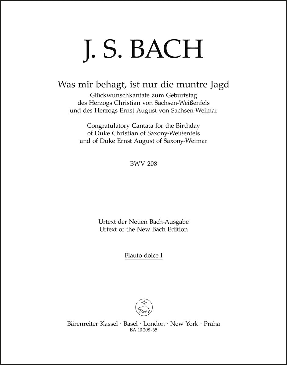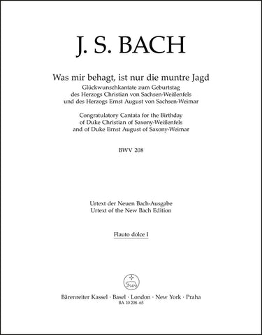 **Title**: Was mir behagt, ist nur die muntre Jagd BWV 208 | **Subtitle**: Congratulatory Cantata for the Birthday of Duke Christian of Saxony-Weißenfels and of Duke Ernst August of Saxony-Weimar | **Composer / Author**: Bach, Johann Sebastian | **Editor**: Dürr, Alfred | **Edition Type**: Wind set, Urtext edition | **Scoring/ Instrumentation**: Treble recorders (2), Oboes da caccia (2), Bassoon, Cornos da caccia (2) | **Binding**: Stapled | **Duration**: 00:38:00 | **Weight**: 128.0 g | **Format**: 32,5 x 25,5 cm | **Pages**: 3/3/4/4/4/4/4 S. | **Language**: EN | Sample: https://data.baerenreiter.com/NB/BA/BA10208_65_9790006491780_nb_lrg_01.jpg