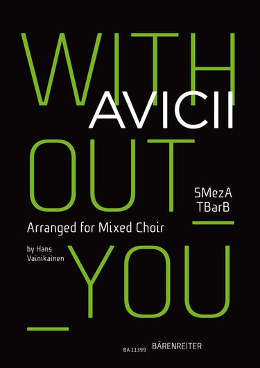 **Title**: Without you | **Arranged for**: Arranged for Mixed Choir (SMezATBarB) | **Composer / Author**: Bergling, Tim / Pontare, Vincent / Al Fakir, Salem / Lennevald, Dhani / Cavazza, Sandro / Falk, Carl | **Arranger**: Vainikainen, Hans | **Editor**: Vainikainen, Hans | **Edition Type**: Choral score | **Instrumentation**: Choir | **Scoring/ Instrumentation**: Mixed choir (SMezATBarB) | **Binding**: Stapled | **Level of Difficulty**: 3.0 | **Printing**: 1st printing 2019 | **Language of Text Part**: English | **Weight**: 43.0 g | **Format**: 29,7 x 21,0 cm | **Pages**: 11 S. | **Language**: EN | Sample: https://data.baerenreiter.com/NB/BA/BA11399_00_9790006568611_nb_lrg_01.jpg