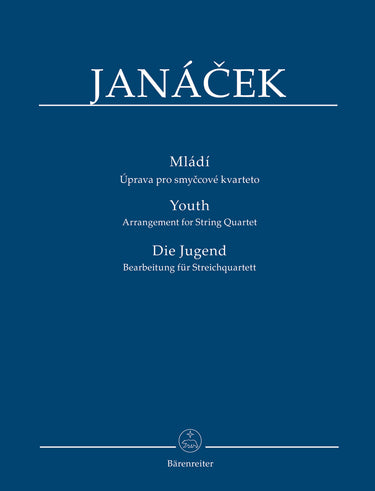 **Title**: Youth | **Arranged for**: Arrangement for String Quartet | **Composer / Author**: Janácek, Leoš | **Arranger**: Maratka, Kryštof | **Edition Type**: Study score | **Instrumentation**: String quartet | **Binding**: Stapled | **Level of Difficulty**: 3.0 | **Printing**: 1st printing 2017 | **Weight**: 110.0 g | **Format**: 22,5 x 16,5 cm | **Pages**: IX, 36 S. | **Language**: EN | Sample: https://data.baerenreiter.com/NB/TP/TP00521_00_9790260108516_nb_lrg_01.jpg