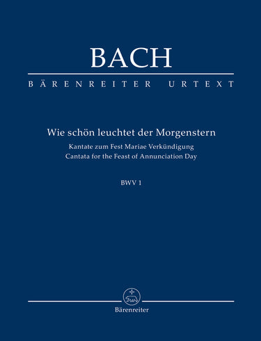 **Title**: How bright and fair the morning star BWV 1 | **Subtitle**: Cantata for the Feast of Annunciation Day | **Comments on Version**: Parts and Vocal Score = BA 10001 | **Composer / Author**: Bach, Johann Sebastian | **Editor**: Wendt, Matthias | **Edition Type**: Study score, Urtext edition | **Binding**: Stapled | **Level of Difficulty**: 3.0 | **Printing**: 1st printing 2007 | **Weight**: 125.0 g | **Format**: 22,5 x 16,5 cm | **Pages**: III, 60 S. | **Language**: EN | Sample: https://data.baerenreiter.com/NB/TP/TP01001_00_9790006205035_nb_lrg_01.jpg