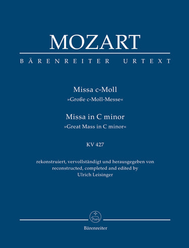 **Title**: Missa in C minor K. 427 "Great Mass in C minor" | **Comments on Version**: Reconstructed and completed by Ulrich Leisinger | **Composer / Author**: Mozart, Wolfgang Amadeus | **Editor**: Leisinger, Ulrich | **Edition Type**: Study score, Urtext edition | **Binding**: Paperback | **Duration**: 00:55:00 | **Printing**: 1st printing 2019 | **Language of Text Part**: Latin | **Weight**: 406.0 g | **Format**: 22,5 x 16,5 cm | **Pages**: XXIX, 173 S. | **Language**: EN | Sample: https://data.baerenreiter.com/NB/TP/TP00988_00_9790006203062_nb_lrg_01.jpg