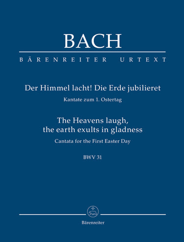 **Title**: The Heavens laugh, the earth exults in gladness BWV 31 | **Subtitle**: Cantata for the 1st Easter Day | **Comments on Version**: Parts and Vocal Score = BA 10031 | **Composer / Author**: Bach, Johann Sebastian | **Editor**: Dürr, Alfred | **Edition Type**: Study score, Urtext edition | **Binding**: Stapled | **Level of Difficulty**: 3.0 | **Duration**: 00:23:00 | **Printing**: 2nd printing 2019 | **Weight**: 153.0 g | **Format**: 22,5 x 16,5 cm | **Pages**: VI, 61 S. | **Language**: EN | Sample: https://data.baerenreiter.com/NB/TP/TP01031_00_9790006204090_nb_lrg_01.jpg
