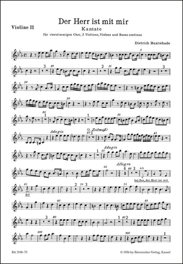 **Title**: Der Herr ist mit mir BuxWV 15 | **Subtitle**: Cantata | **Composer / Author**: Buxtehude, Dietrich | **Editor**: Grusnick, Bruno | **Edition Type**: Part | **Scoring/ Instrumentation**: 2. Violin | **Binding**: Stapled | **Weight**: 5.0 g | **Format**: 27,0 x 19,0 cm | **Pages**: 2 S. | **Language**: EN | Sample: https://data.baerenreiter.com/NB/BA/BA03198_75_9790006431304_nb_lrg_01.jpg