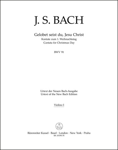 **Title**: Gelobet seist du, Jesu Christ BWV 91 | **Subtitle**: Cantata for Christmas Day | **Comments on Version**: Study score = TP 1091 | **Composer / Author**: Bach, Johann Sebastian | **Editor**: Dürr, Alfred | **Edition Type**: Part, Urtext edition | **Scoring/ Instrumentation**: 1. Violin | **Binding**: Stapled | **Duration**: 00:19:00 | **Weight**: 30.0 g | **Format**: 32,5 x 25,5 cm | **Pages**: 5 S. | **Language**: EN | Sample: https://data.baerenreiter.com/NB/BA/BA10091_74_9790006490745_nb_lrg_01.jpg