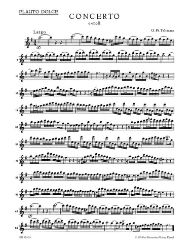 **Title**: Konzert für Blockflöte, Querflöte, zwei Violinen, Viola und Basso continuo e-Moll TWV 52:e1 | **Composer / Author**: Telemann, Georg Philipp | **Editor**: Kölbel, Herbert | **Edition Type**: Part | **Scoring/ Instrumentation**: Treble recorder | **Binding**: Stapled | **Weight**: 28.0 g | **Format**: 30,0 x 23,0 cm | **Pages**: 6 S. | **Language**: EN | Sample: https://data.baerenreiter.com/NB/HM/HM00124_24_9790006002566_nb_lrg_01.jpg
