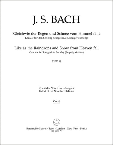 **Title**: Like as the Raindrops and Snow from Heaven fall BWV 18 | **Subtitle**: Cantata for Sunday Sexagesimae | **Misc Information**: Leipzig Version | **Comments on Version**: Study score = TP 1018 | **Composer / Author**: Bach, Johann Sebastian | **Editor**: Neumann, Werner | **Edition Type**: Part, Urtext edition | **Scoring/ Instrumentation**: 1. Viola | **Binding**: Stapled | **Weight**: 30.0 g | **Format**: 32,5 x 25,5 cm | **Pages**: 5 S. | **Language**: EN | Sample: https://data.baerenreiter.com/NB/BA/BA10018_79_9790006489961_nb_lrg_01.jpg