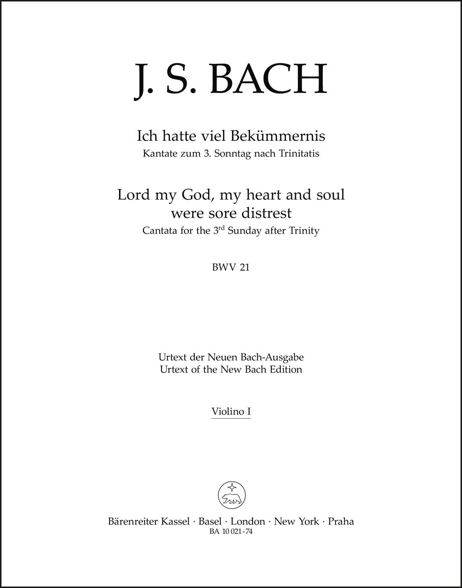 **Title**: Lord my God, my heart and soul were sore distrest BWV 21 | **Subtitle**: Cantata for the 3rd Sunday after Trinity | **Comments on Version**: Study score = TP 1021 | **Composer / Author**: Bach, Johann Sebastian | **Editor**: Bozarth, George S. / Brainard, Paul | **Edition Type**: Part, Urtext edition | **Scoring/ Instrumentation**: 1. Violin | **Binding**: Stapled | **Weight**: 33.0 g | **Format**: 32,5 x 25,5 cm | **Pages**: 8 S. | **Language**: EN | Sample: https://data.baerenreiter.com/NB/BA/BA10021_74_9790006538058_nb_lrg_01.jpg