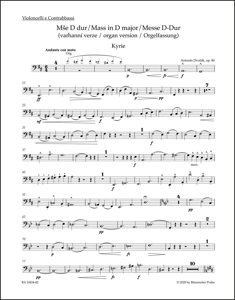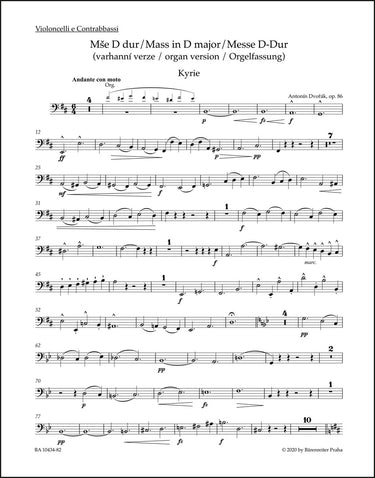 **Title**: Mass in D major op. 86 | **Misc Information**: Organ version | **Comments**: Not compatible with BA 7511, H 4952, H 4839, H 4839-72 | **Composer / Author**: Dvorak, Antonin | **Editor**: Utidjian, Haig | **Edition Type**: Part, Urtext edition | **Scoring/ Instrumentation**: Violoncello, Double bass | **Binding**: Stapled | **Level of Difficulty**: 3.0 | **Weight**: 34.0 g | **Format**: 32,5 x 25,5 cm | **Pages**: 8 S. | **Language**: EN | Sample: https://data.baerenreiter.com/NB/BA/BA10434_82_9790260108530_nb_lrg_01.jpg