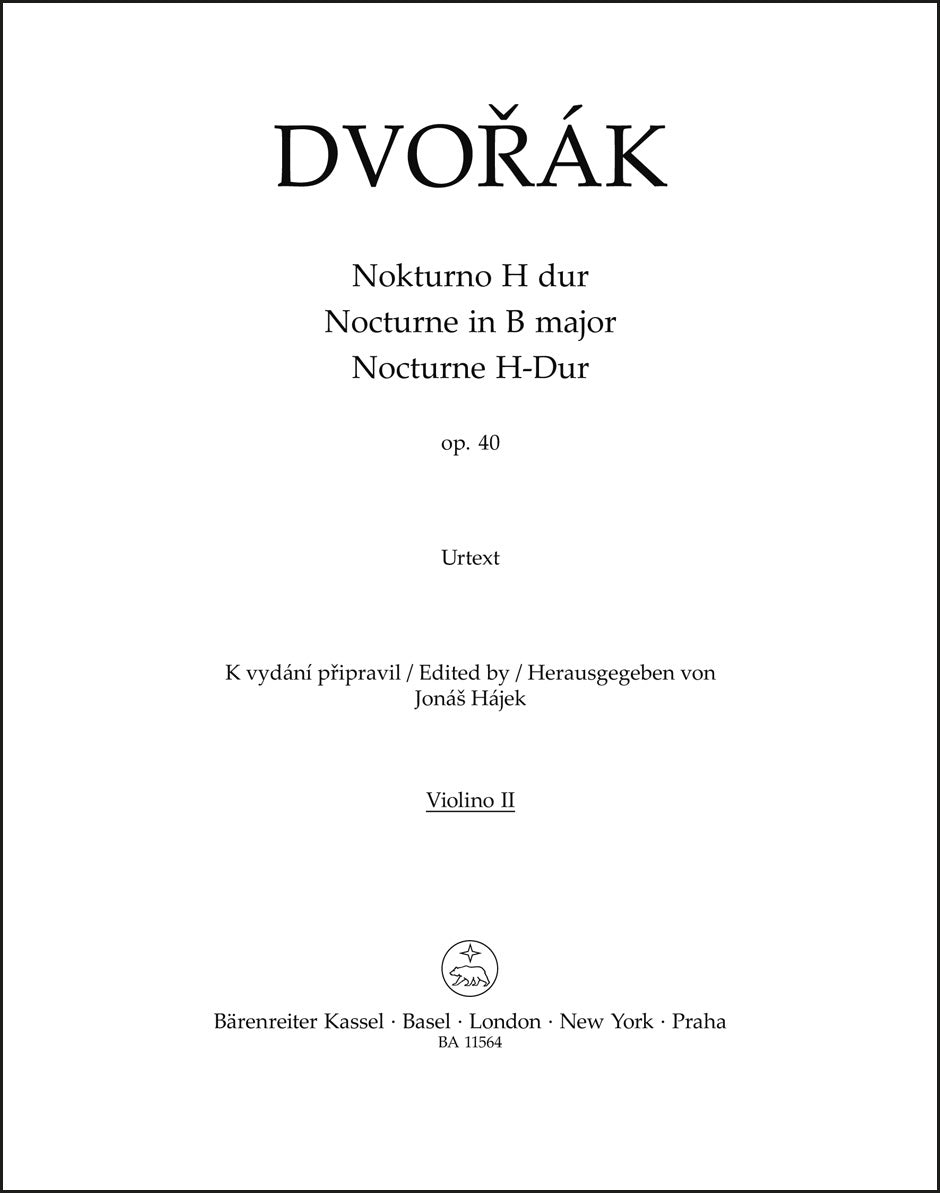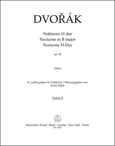 **Title**: Nocturne for String Orchestra in B major op. 40 | **Composer / Author**: Dvorak, Antonin | **Editor**: Hájek, Jonáš | **Edition Type**: Part, Urtext edition | **Scoring/ Instrumentation**: 2. Violin | **Binding**: Stapled | **Level of Difficulty**: 2.0 | **Weight**: 14.0 g | **Format**: 31,0 x 24,0 cm | **Pages**: 3 S. | **Language**: EN | Sample: https://data.baerenreiter.com/NB/BA/BA11564_75_9790260109162_nb_lrg_01.jpg
