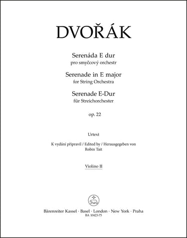 **Title**: Serenade for String Orchestra in E major op. 22 | **Composer / Author**: Dvorak, Antonin | **Editor**: Tait, Robin | **Edition Type**: Part, Urtext edition | **Scoring/ Instrumentation**: 2. Violin | **Binding**: Stapled | **Weight**: 65.0 g | **Format**: 32,5 x 25,5 cm | **Pages**: 15 S. | **Language**: EN | Sample: https://data.baerenreiter.com/NB/BA/BA10423_75_9790260107557_nb_lrg_01.jpg