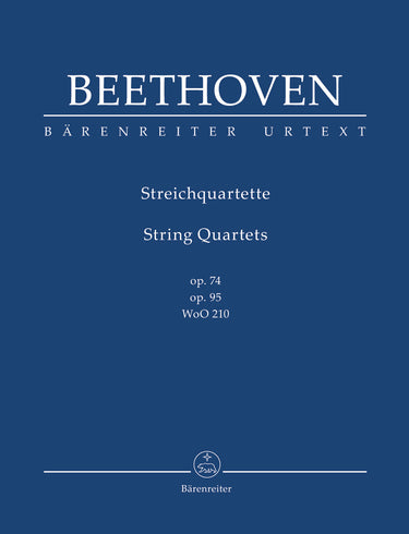 **Title**: String Quartets opp. 74, 95 / Allegretto in B minor WoO 210 | **Composer / Author**: Beethoven, Ludwig van | **Editor**: Del Mar, Jonathan | **Preface**: Cooper, Barry / Del Mar, Jonathan | **Edition Type**: Study score, Urtext edition | **Instrumentation**: String quartet | **Binding**: Paperback | **Printing**: 2nd printing 2019 | **Weight**: 174.0 g | **Format**: 22,5 x 16,5 cm | **Pages**: XVI, 64 S. | **Language**: EN | Sample: https://data.baerenreiter.com/NB/TP/TP00918_00_9790006204793_nb_lrg_01.jpg