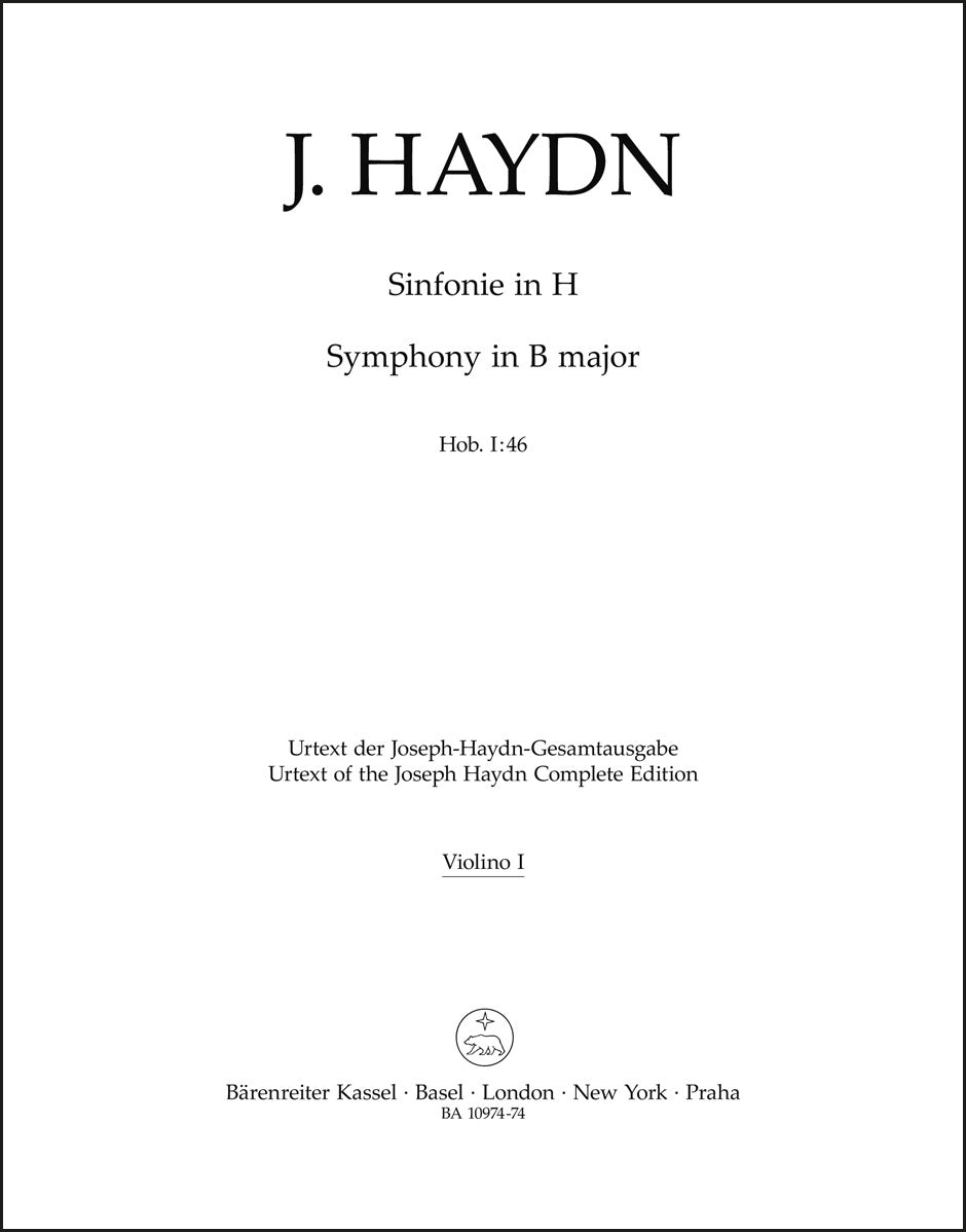 **Title**: Symphony in B major Hob. I:46 | **Comments on Version**: Urtext from: Joseph Haydn Werke, G. Henle Verlag Munich | **Composer / Author**: Haydn, Joseph | **Editor**: Mörner, Carl-Gabriel Stellan | **Edition Type**: Part, Urtext edition | **Scoring/ Instrumentation**: 1. Violin | **Binding**: Stapled | **Duration**: 00:19:00 | **Weight**: 50.0 g | **Format**: 32,5 x 25,5 cm | **Pages**: 9 S. | **Language**: EN | Sample: https://data.baerenreiter.com/NB/BA/BA10974_74_9790006522781_nb_lrg_01.jpg