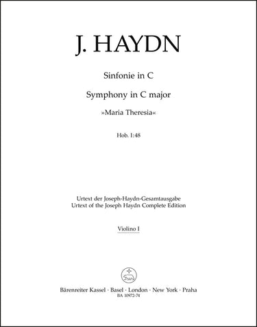 **Title**: Symphony in C major Hob. I:48 "Maria Theresia" | **Comments on Version**: Urtext from: Joseph Haydn Werke, G. Henle Verlag Munich | **Composer / Author**: Haydn, Joseph | **Editor**: Friesenhagen, Andreas / Heitmann, Christin | **Edition Type**: Part, Urtext edition | **Scoring/ Instrumentation**: 1. Violin | **Binding**: Stapled | **Weight**: 50.0 g | **Format**: 32,5 x 25,5 cm | **Pages**: 11 S. | **Language**: EN | Sample: https://data.baerenreiter.com/NB/BA/BA10972_74_9790006542598_nb_lrg_01.jpg