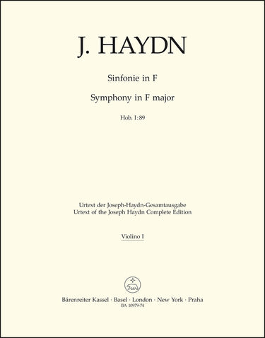 **Title**: Symphony in F major Hob. I:89 | **Comments on Version**: Urtext from the Henle Complete Edition of the Works of Joseph Haydn | **Composer / Author**: Haydn, Joseph | **Editor**: Friesenhagen, Andreas | **Edition Type**: Part, Urtext edition | **Scoring/ Instrumentation**: 1. Violin | **Binding**: Stapled | **Weight**: 33.0 g | **Format**: 32,5 x 25,5 cm | **Pages**: 7 S. | **Language**: EN | Sample: https://data.baerenreiter.com/NB/BA/BA10979_74_9790006562794_nb_lrg_01.jpg