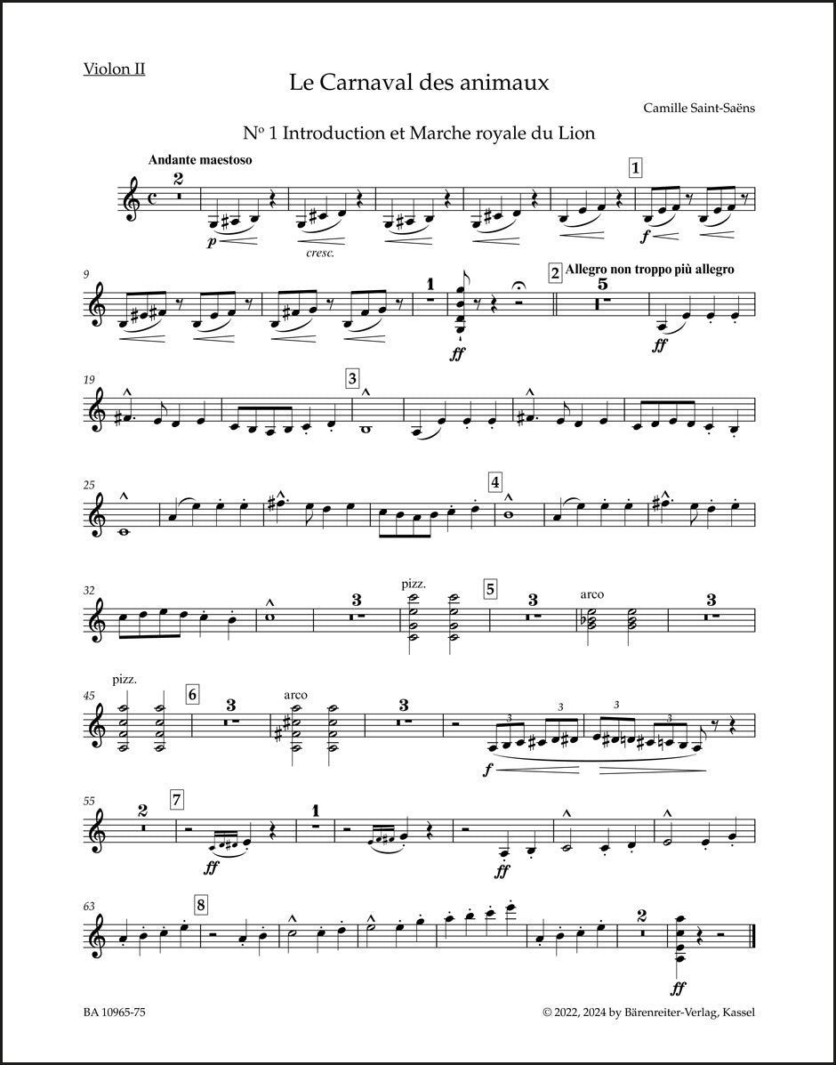 **Title**: The Carnival of Animals | **Subtitle**: A Grand Zoological Fantasy | **Composer / Author**: Saint-Saëns, Camille | **Editor**: Teller Ratner, Sabina | **Edition Type**: Part, Urtext edition | **Scoring/ Instrumentation**: 2. Violin | **Binding**: Stapled | **Level of Difficulty**: 3.0 | **Weight**: 33.0 g | **Format**: 35,5 x 25,5 cm | **Pages**: 7 S. | **Language**: EN | Sample: https://data.baerenreiter.com/NB/BA/BA10965_75_9790006577996_nb_lrg_01.jpg