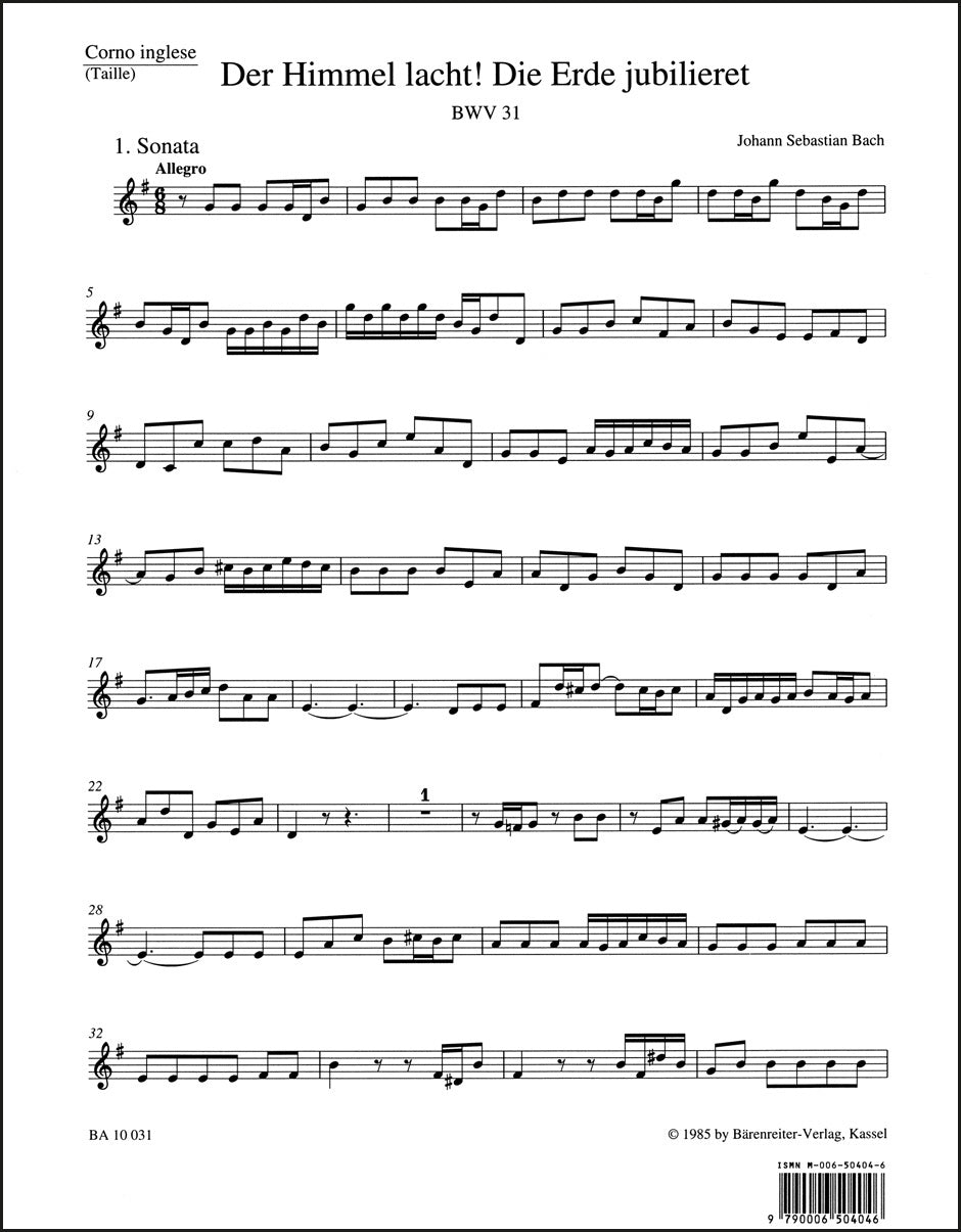 **Title**: The Heavens laugh, the earth exults in gladness BWV 31 | **Subtitle**: Cantata for the 1st Easter Day | **Comments on Version**: Study score = TP 1031 | **Composer / Author**: Bach, Johann Sebastian | **Editor**: Dürr, Alfred | **Edition Type**: Part, Urtext edition | **Scoring/ Instrumentation**: Cor anglais | **Binding**: Folded | **Duration**: 00:23:00 | **Weight**: 15.0 g | **Format**: 32,5 x 25,5 cm | **Pages**: 5 S. | **Language**: EN | Sample: https://data.baerenreiter.com/NB/BA/BA10031_32_9790006504046_nb_lrg_01.jpg