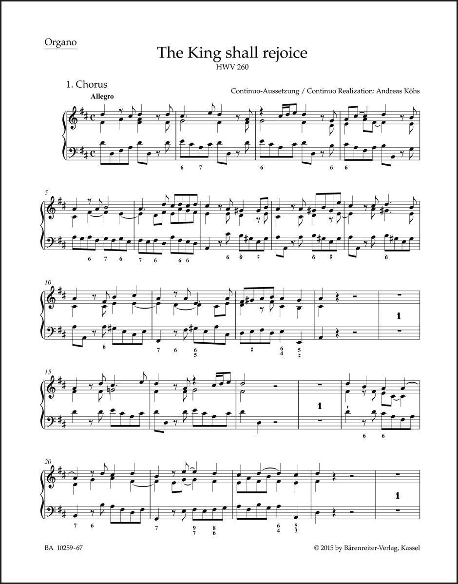 **Title**: The King shall rejoice HWV 260 | **Subtitle**: Coronation Anthem | **Comments on Version**: Continuo realization: Andreas Köhs | **Composer / Author**: Handel, George Frideric | **Editor**: Blaut, Stephan | **Edition Type**: Part, Urtext edition | **Scoring/ Instrumentation**: Organ | **Binding**: Stapled | **Weight**: 49.0 g | **Format**: 32,5 x 25,5 cm | **Pages**: 10 S. | **Language**: EN | Sample: https://data.baerenreiter.com/NB/BA/BA10259_67_9790006562244_nb_lrg_01.jpg