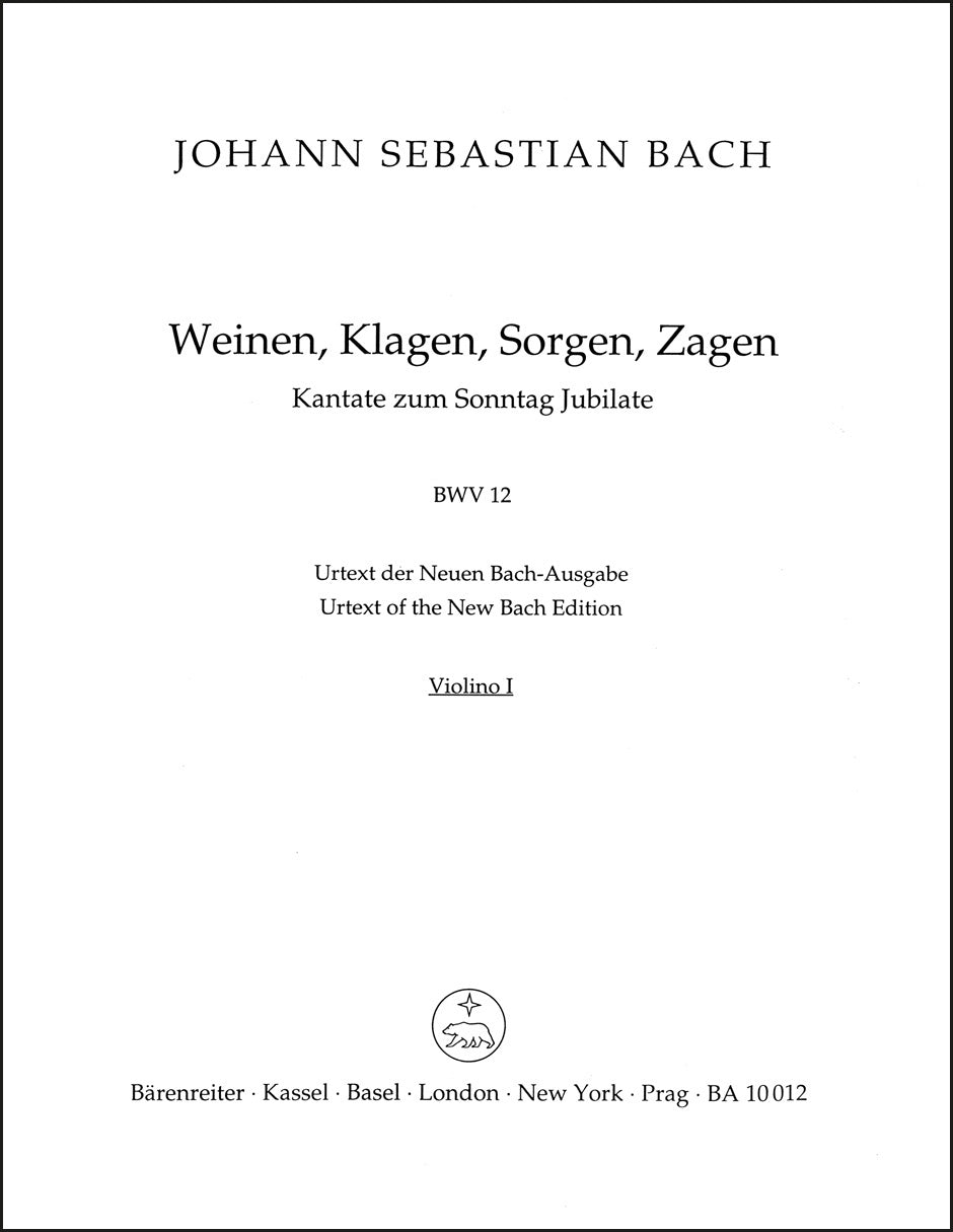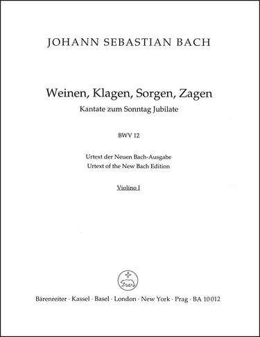 **Title**: Weeping, crying, sorrow, sighing BWV 12 | **Subtitle**: Cantata for the Sunday Jubilate | **Comments on Version**: Study score = TP 1012 | **Composer / Author**: Bach, Johann Sebastian | **Editor**: Emans, Reinmar | **Edition Type**: Part, Urtext edition | **Scoring/ Instrumentation**: 1. Violin | **Binding**: Folded | **Duration**: 00:28:00 | **Weight**: 15.0 g | **Format**: 32,5 x 25,5 cm | **Pages**: 4 S. | **Language**: EN | Sample: https://data.baerenreiter.com/NB/BA/BA10012_74_9790006503100_nb_lrg_01.jpg
