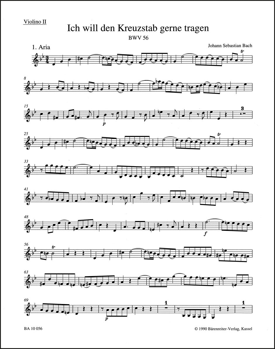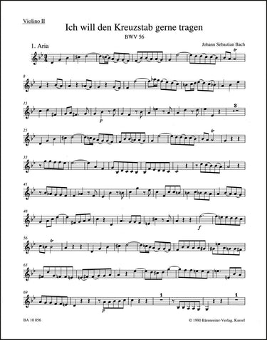 **Title**: I will my cross-staff gladly carry BWV 56 "Cross Staff Cantata (Kreuzstabkantate)" | **Subtitle**: Cantata for the 19th Sunday after Trinity | **Comments on Version**: Study score = TP 1056 | **Composer / Author**: Bach, Johann Sebastian | **Editor**: Wendt, Matthias | **Edition Type**: Part, Urtext edition | **Scoring/ Instrumentation**: 2. Violin | **Binding**: Folded | **Duration**: 00:21:00 | **Weight**: 15.0 g | **Format**: 32,5 x 25,5 cm | **Pages**: 3 S. | **Language**: EN | Sample: https://data.baerenreiter.com/NB/BA/BA10056_75_9790006503285_nb_lrg_01.jpg