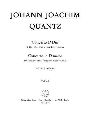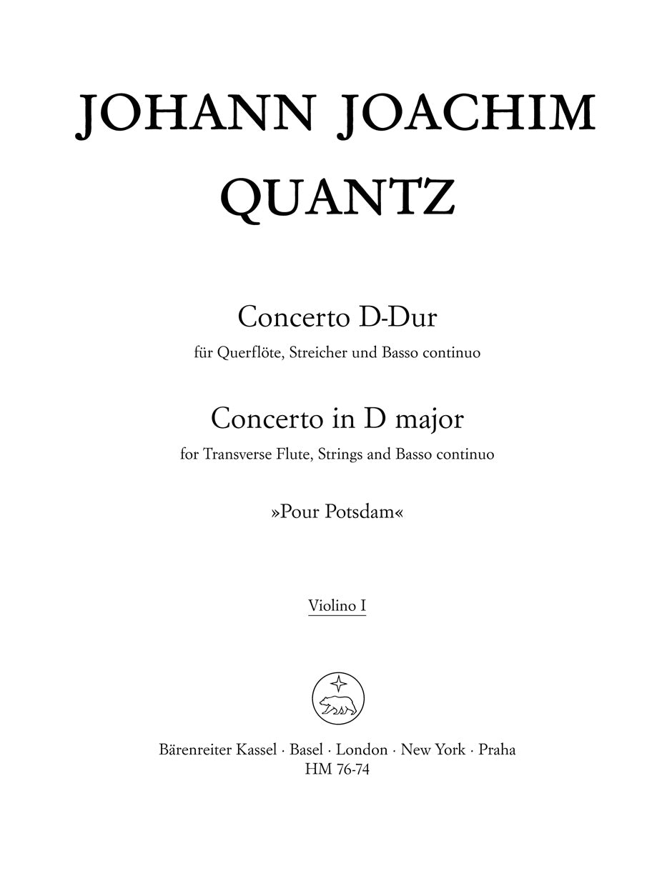**Title**: Konzert "Pour Potsdam" D-Dur | **Subtitle**: Flötenkonzert | **Composer / Author**: Quantz, Johann Joachim | **Editor**: Upmeyer, Walter | **Edition Type**: Part | **Scoring/ Instrumentation**: 1. Violin | **Binding**: Stapled | **Weight**: 28.0 g | **Format**: 30,0 x 23,0 cm | **Pages**: 8 S. | **Language**: EN | Sample: https://data.baerenreiter.com/NB/HM/HM00076_74_9790006001507_nb_lrg_01.jpg