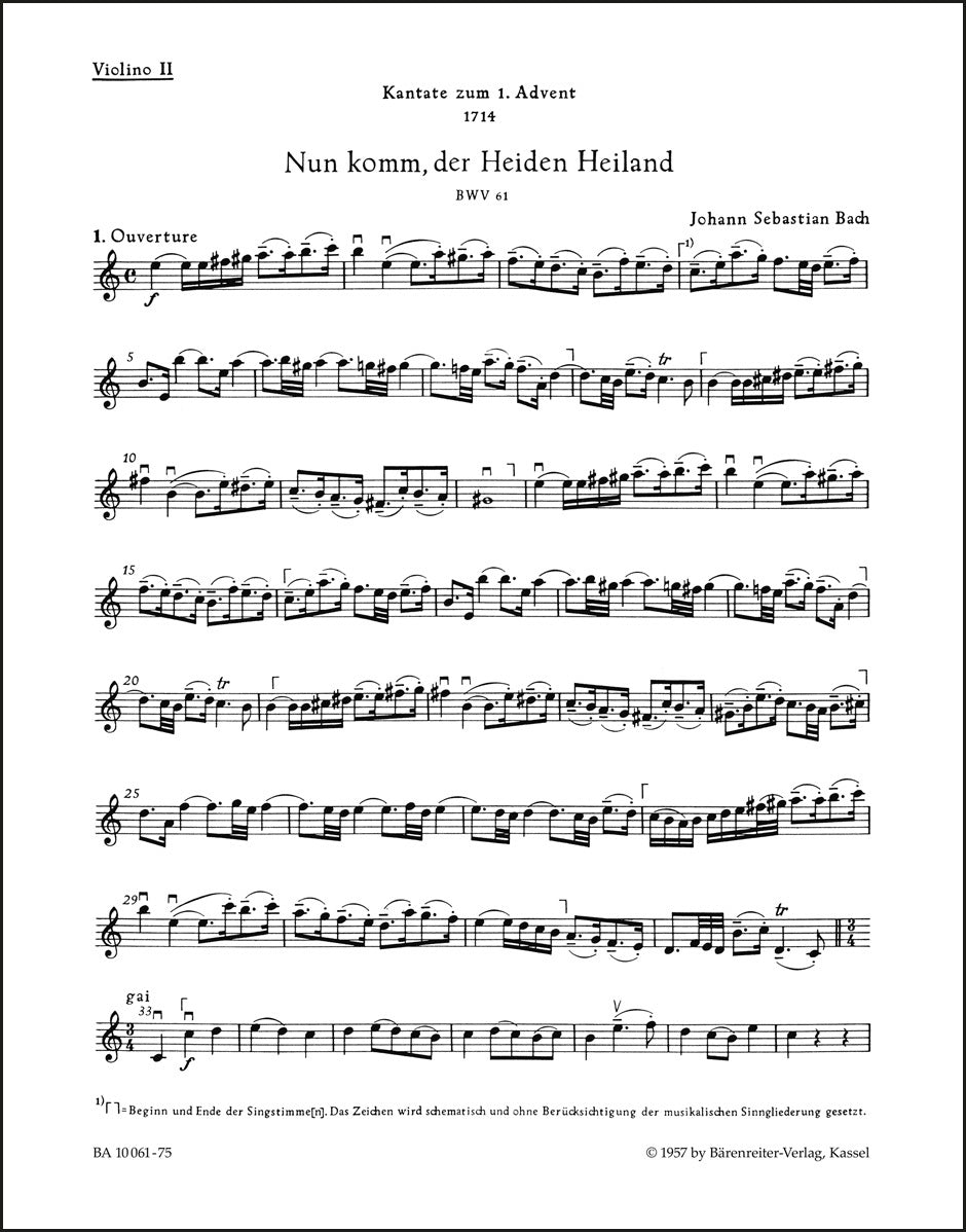 **Title**: Nun komm, der Heiden Heiland BWV 61 | **Subtitle**: Cantata for the First Sunday of Advent | **Comments on Version**: Study score = TP 1061 | **Composer / Author**: Bach, Johann Sebastian | **Editor**: Dürr, Alfred | **Edition Type**: Part, Urtext edition | **Scoring/ Instrumentation**: 2. Violin | **Binding**: Folded | **Weight**: 16.0 g | **Format**: 32,5 x 25,5 cm | **Pages**: 4 S. | **Language**: EN | Sample: https://data.baerenreiter.com/NB/BA/BA10061_75_9790006490271_nb_lrg_01.jpg