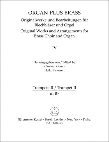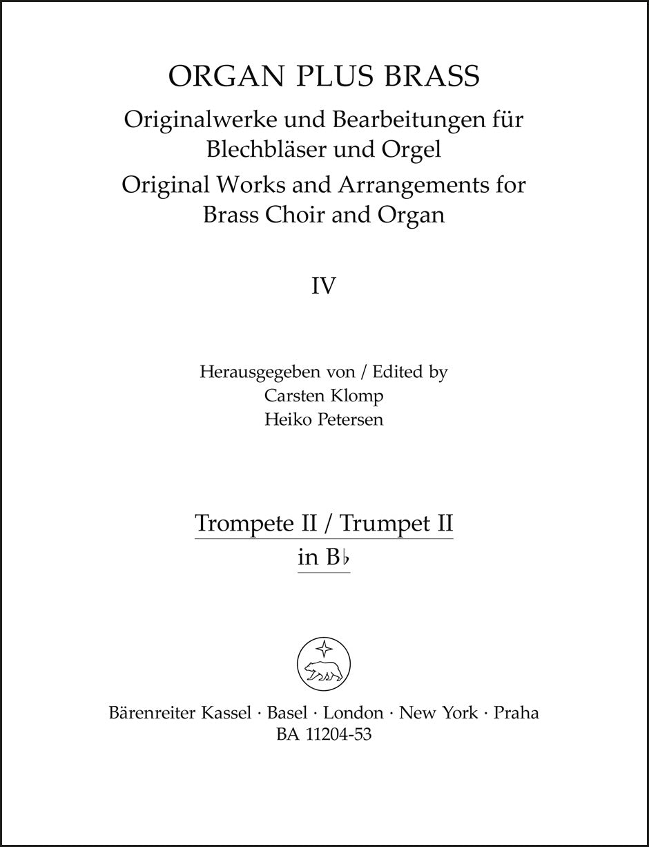 **Title**: organ plus brass, Band IV: Cathedral Sounds | **Misc Information**: Arrangements for brass choir and organ | **Composer / Author**: Stanford, Charles Villiers | **Arranger**: Klomp, Carsten | **Editor**: Klomp, Carsten / Petersen, Heiko | **Preface**: Klomp, Carsten / Petersen, Heiko | **Edition Type**: Part | **Scoring/ Instrumentation**: 2. Trumpet | **Binding**: Stapled | **Level of Difficulty**: 3.0 | **Weight**: 28.0 g | **Format**: 30,0 x 23,0 cm | **Pages**: 5 S. | **Language**: EN | Sample: https://data.baerenreiter.com/NB/BA/BA11204_53_9790006558650_nb_lrg_01.jpg