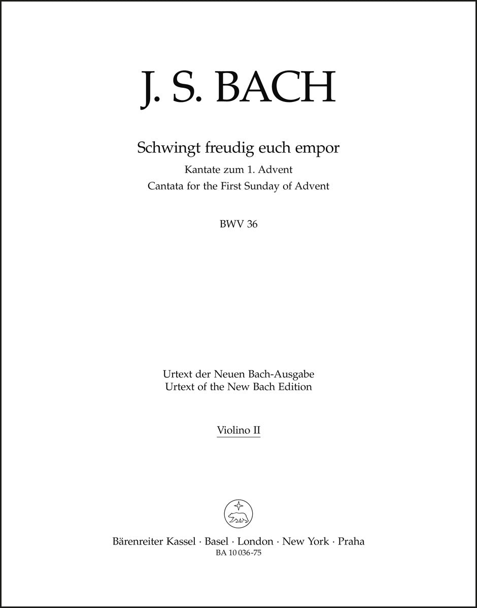 **Title**: Schwingt freudig euch empor BWV 36 | **Subtitle**: Cantata for the First of Advent | **Misc Information**: Final version | **Comments on Version**: Study score = TP 1036 | **Composer / Author**: Bach, Johann Sebastian | **Editor**: Dürr, Alfred | **Edition Type**: Part, Urtext edition | **Scoring/ Instrumentation**: 2. Violin | **Binding**: Folded | **Weight**: 18.0 g | **Format**: 32,5 x 25,5 cm | **Pages**: 4 S. | **Language**: EN | Sample: https://data.baerenreiter.com/NB/BA/BA10036_75_9790006490103_nb_lrg_01.jpg