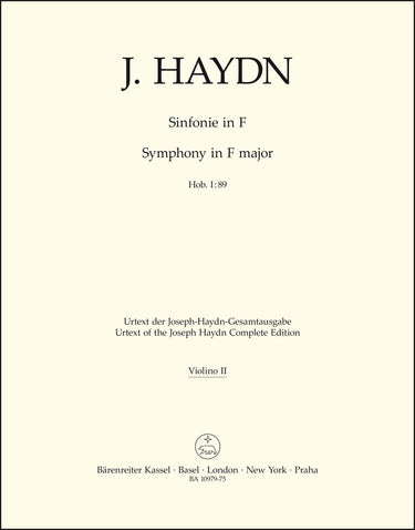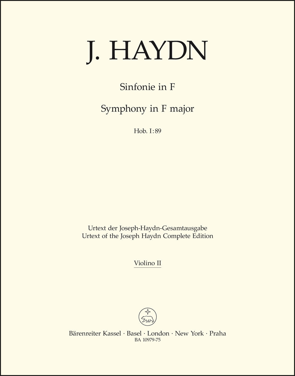**Title**: Symphony in F major Hob. I:89 | **Comments on Version**: Urtext from the Henle Complete Edition of the Works of Joseph Haydn | **Composer / Author**: Haydn, Joseph | **Editor**: Friesenhagen, Andreas | **Edition Type**: Part, Urtext edition | **Scoring/ Instrumentation**: 2. Violin | **Binding**: Stapled | **Weight**: 33.0 g | **Format**: 32,5 x 25,5 cm | **Pages**: 7 S. | **Language**: EN | Sample: https://data.baerenreiter.com/NB/BA/BA10979_75_9790006562800_nb_lrg_01.jpg