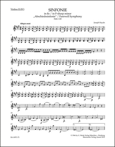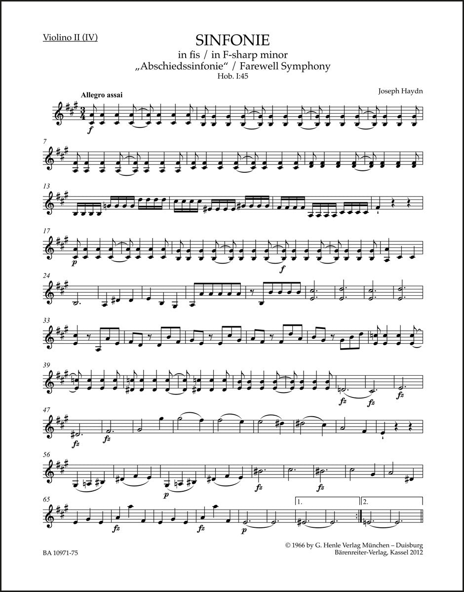**Title**: Symphony in F-sharp minor Hob. I:45 "Farewell Symphony" | **Comments on Version**: Urtext from: Joseph Haydn Werke, G. Henle Verlag Munich | **Composer / Author**: Haydn, Joseph | **Editor**: Mörner, Carl-Gabriel Stellan | **Edition Type**: Part, Urtext edition | **Scoring/ Instrumentation**: 2. Violin (4. Violin) | **Binding**: Stapled | **Weight**: 50.0 g | **Format**: 32,5 x 25,5 cm | **Pages**: 11 S. | **Language**: EN | Sample: https://data.baerenreiter.com/NB/BA/BA10971_75_9790006542574_nb_lrg_01.jpg