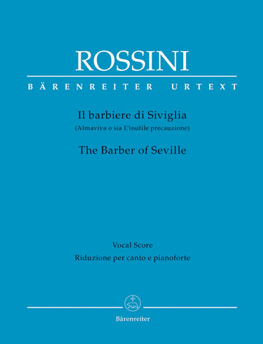**Title**: The Barber of Seville | **Subtitle**: Commedia in due atti (comedy in two acts) | **Composer / Author**: Rossini, Gioachino | **Libretto/Text by**: Sterbini, Cesare | **Editor**: Brauner, Patricia B. | **Edition Type**: Vocal Score, Urtext edition | **Instrumentation**: Soloists, Choir, Orchestra | **Binding**: Hardback | **Printing**: 1st printing 2010 | **Language of Text Part**: Italian, English | **Weight**: 1493.0 g | **Format**: 27,5 x 20,0 cm | **Pages**: XIII, 517 S. | **Language**: EN | Sample: https://data.baerenreiter.com/NB/BA/BA10506_92_9790006537822_nb_lrg_01.jpg