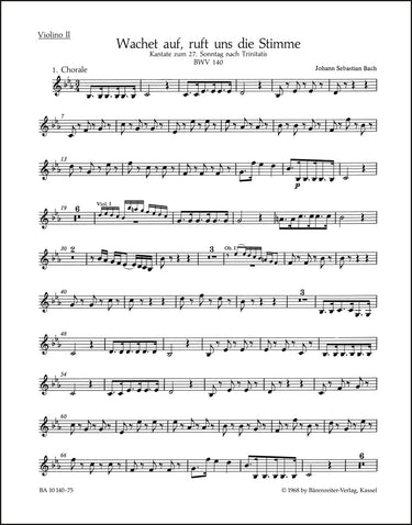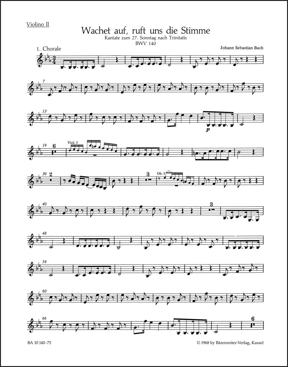 **Title**: Wake ye maids! hark, strikes the hour BWV 140 | **Subtitle**: Cantata for the 27th sunday after Trinity | **Comments**: Study score = TP 1140 | **Composer / Author**: Bach, Johann Sebastian | **Editor**: Dürr, Alfred | **Edition Type**: Part, Urtext edition | **Scoring/ Instrumentation**: 2. Violin | **Binding**: Stapled | **Duration**: 00:31:00 | **Weight**: 33.0 g | **Format**: 32,5 x 25,5 cm | **Pages**: 6 S. | **Language**: EN | Sample: https://data.baerenreiter.com/NB/BA/BA10140_75_9790006491216_nb_lrg_01.jpg