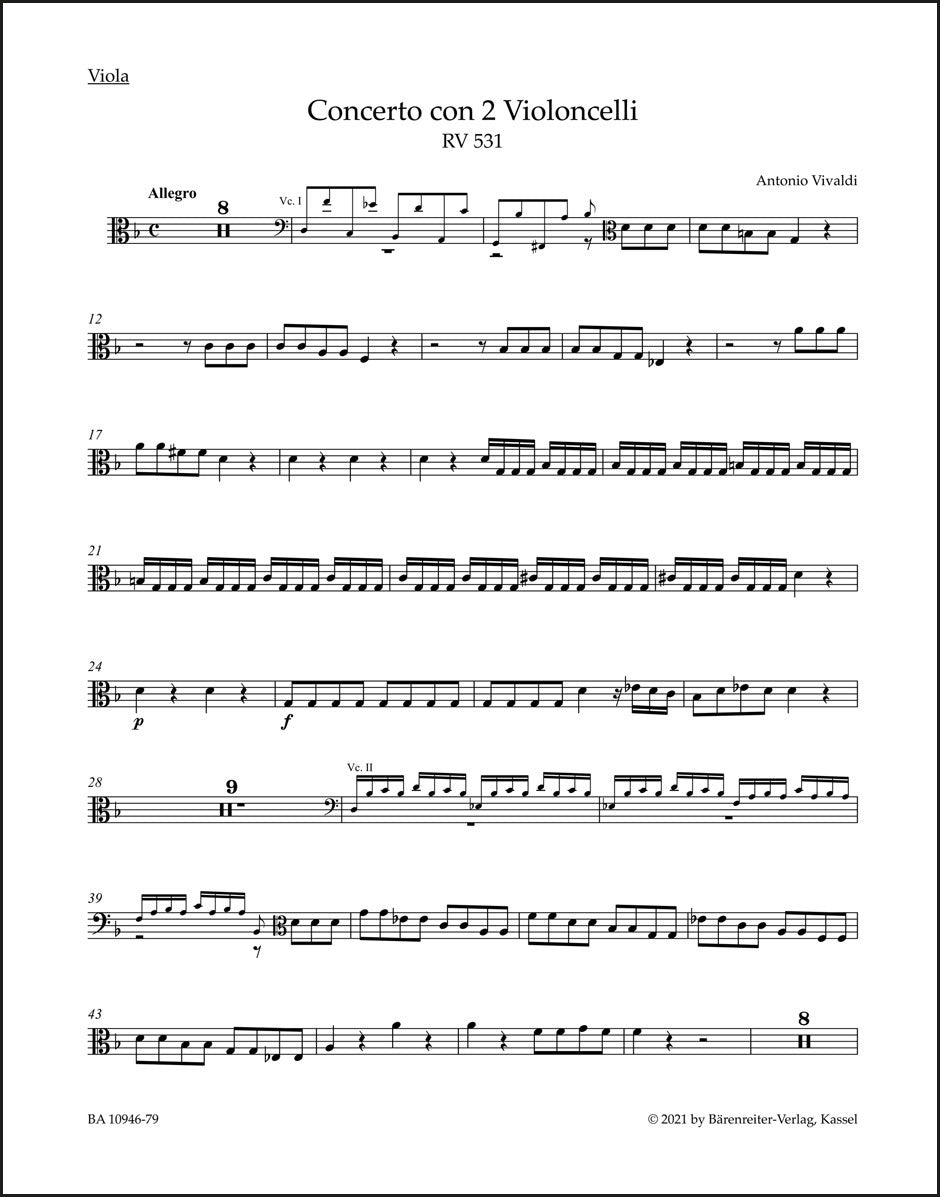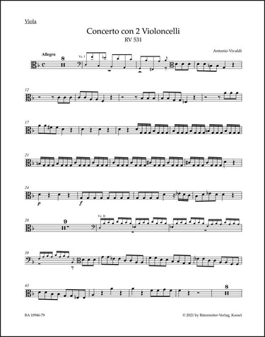 **Title**: Concerto for two Violoncellos, Strings and Basso continuo in G minor RV 531 | **Composer / Author**: Vivaldi, Antonio | **Editor**: Schwemer, Bettina | **Edition Type**: Part, Urtext edition | **Scoring/ Instrumentation**: Viola | **Binding**: Folded | **Weight**: 16.0 g | **Format**: 32,5 x 25,5 cm | **Pages**: 3 S. | **Language**: EN | Sample: https://data.baerenreiter.com/NB/BA/BA10946_79_9790006569786_nb_lrg_01.jpg