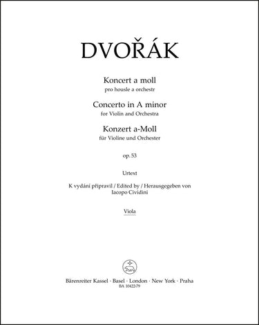 **Title**: Concerto for Violin and Orchestra in A minor op. 53 | **Composer / Author**: Dvorak, Antonin | **Editor**: Cividini, Iacopo | **Edition Type**: Part, Urtext edition | **Scoring/ Instrumentation**: Viola | **Binding**: Stapled | **Weight**: 50.0 g | **Format**: 32,5 x 25,5 cm | **Pages**: 12 S. | **Language**: EN | Sample: https://data.baerenreiter.com/NB/BA/BA10422_79_9790260108141_nb_lrg_01.jpg
