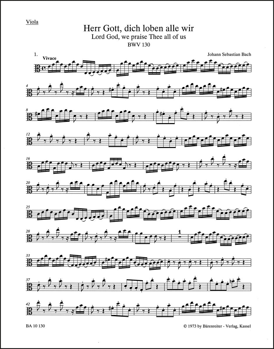 **Title**: Lord God, we praise Thee all of us BWV 130 | **Subtitle**: Cantata for the Feast of St. Michael | **Comments on Version**: Study score = TP 1130 | **Composer / Author**: Bach, Johann Sebastian | **Editor**: Helms, Marianne | **Edition Type**: Part, Urtext edition | **Scoring/ Instrumentation**: Viola | **Binding**: Folded | **Weight**: 14.0 g | **Format**: 32,6 x 25,6 cm | **Pages**: 5 S. | **Language**: EN | Sample: https://data.baerenreiter.com/NB/BA/BA10130_79_9790006490967_nb_lrg_01.jpg