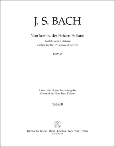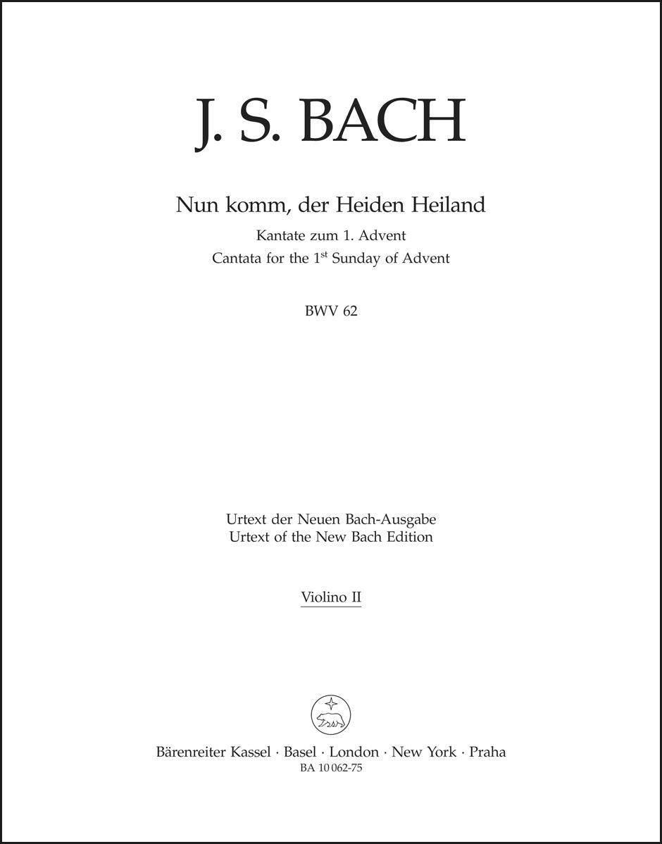 **Title**: Nun komm, der Heiden Heiland BWV 62 | **Subtitle**: Cantata for the 1st Advent | **Composer / Author**: Bach, Johann Sebastian | **Editor**: Raphael, Günter | **Edition Type**: Part, Urtext edition | **Scoring/ Instrumentation**: 2. Violin | **Binding**: Stapled | **Duration**: 00:22:00 | **Weight**: 33.0 g | **Format**: 32,5 x 25,5 cm | **Pages**: 6 S. | **Language**: EN | Sample: https://data.baerenreiter.com/NB/BA/BA10062_75_9790006490370_nb_lrg_01.jpg