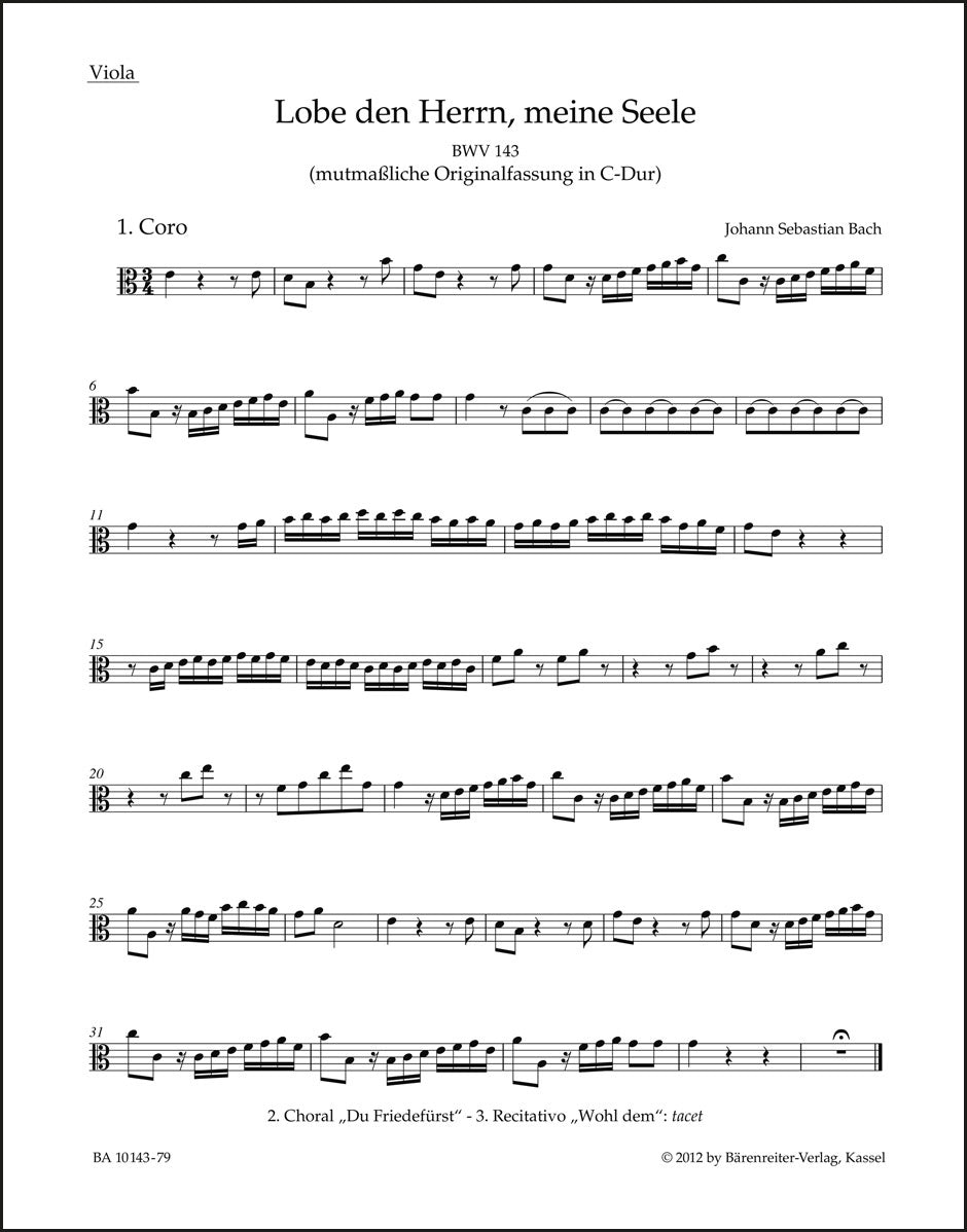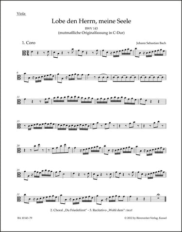**Title**: Praise thou the Lord, o my spirit BWV 143 | **Subtitle**: Cantata for soloists, choir and orchestra | **Misc Information**: Urtext of the New Bach Edition - Revised Edition | **Composer / Author**: Bach, Johann Sebastian | **Editor**: Glöckner, Andreas | **Edition Type**: Part, Urtext edition | **Scoring/ Instrumentation**: Viola | **Binding**: Folded | **Weight**: 17.0 g | **Format**: 32,5 x 25,5 cm | **Pages**: 3 S. | **Language**: EN | Sample: https://data.baerenreiter.com/NB/BA/BA10143_79_9790006542468_nb_lrg_01.jpg