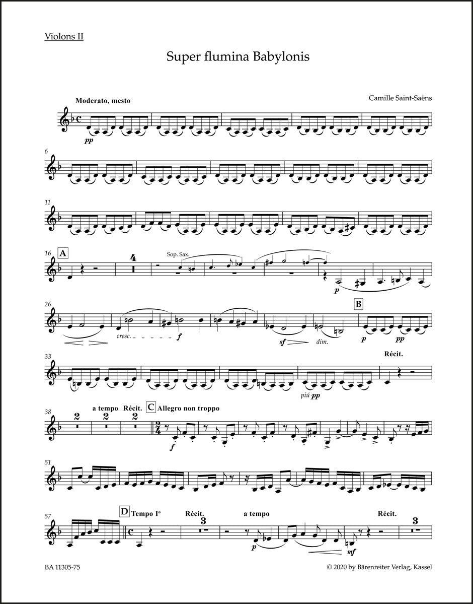 **Title**: Super flumina Babylonis | **Composer / Author**: Saint-Saëns, Camille | **Editor**: Stahl, Christina M. | **Edition Type**: Part, Urtext edition | **Scoring/ Instrumentation**: 2. Violin | **Binding**: Stapled | **Language of Text Part**: Latin | **Weight**: 16.0 g | **Format**: 32,5 x 25,5 cm | **Pages**: 3 S. | **Language**: EN | Sample: https://data.baerenreiter.com/NB/BA/BA11305_75_9790006567072_nb_lrg_01.jpg