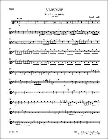 **Title**: Symphony in B-flat major Hob. I:77 | **Comments on Version**: Urtext from: Joseph Haydn Works, G. Henle Verlag Munich | **Composer / Author**: Haydn, Joseph | **Editor**: Gerlach, Sonja / Murray, Sterling E. | **Edition Type**: Part, Urtext edition | **Scoring/ Instrumentation**: Viola | **Binding**: Stapled | **Weight**: 34.0 g | **Format**: 32,5 x 25,5 cm | **Pages**: 7 S. | **Language**: EN | Sample: https://data.baerenreiter.com/NB/BA/BA10986_79_9790006569144_nb_lrg_01.jpg