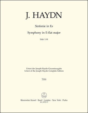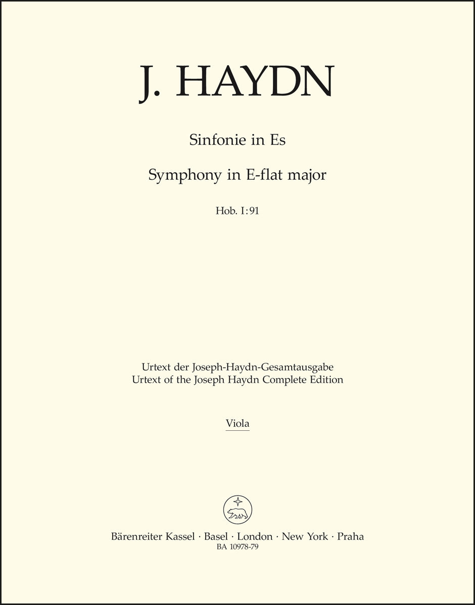 **Title**: Symphony in E-flat major Hob. I:91 | **Comments on Version**: Urtext from the Henle Complete Edition of the Works of Joseph Haydn | **Composer / Author**: Haydn, Joseph | **Editor**: Friesenhagen, Andreas | **Edition Type**: Part, Urtext edition | **Scoring/ Instrumentation**: Viola | **Binding**: Stapled | **Weight**: 50.0 g | **Format**: 32,5 x 25,5 cm | **Pages**: 11 S. | **Language**: EN | Sample: https://data.baerenreiter.com/NB/BA/BA10978_79_9790006559640_nb_lrg_01.jpg