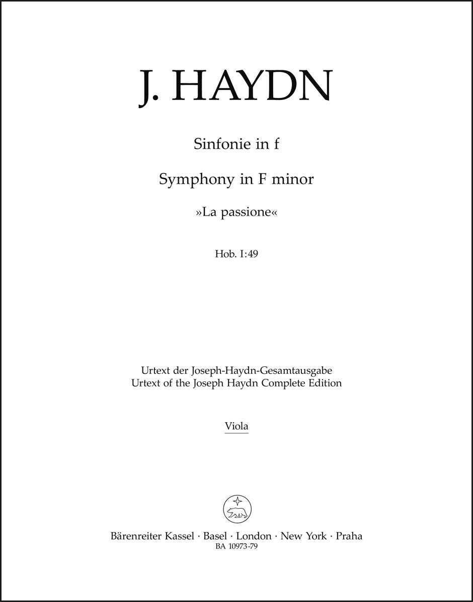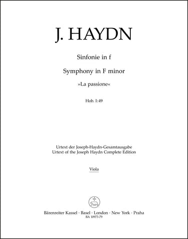 **Title**: Symphony in F minor Hob. I:49 "La passione" | **Comments on Version**: Urtext from: Joseph Haydn Werke, G. Henle Verlag Munich | **Composer / Author**: Haydn, Joseph | **Editor**: Mörner, Carl-Gabriel Stellan | **Edition Type**: Part, Urtext edition | **Scoring/ Instrumentation**: Viola | **Binding**: Stapled | **Level of Difficulty**: 3.0 | **Weight**: 51.0 g | **Format**: 32,5 x 25,5 cm | **Pages**: 9 S. | **Language**: EN | Sample: https://data.baerenreiter.com/NB/BA/BA10973_79_9790006543793_nb_lrg_01.jpg