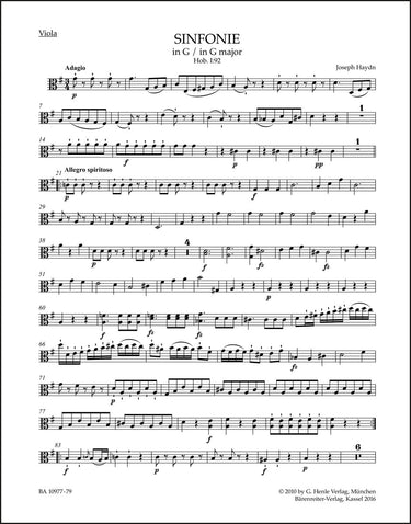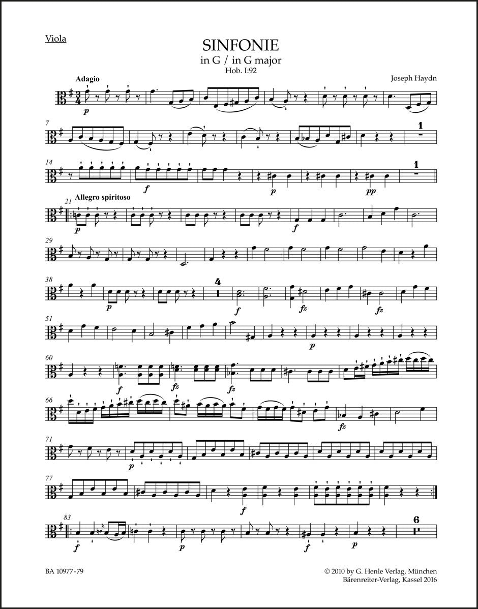 **Title**: Symphony in G major Hob. I:92 "Oxford" | **Comments on Version**: Urtext from the Henle Complete Edition of the Works of Joseph Haydn | **Composer / Author**: Haydn, Joseph | **Editor**: Friesenhagen, Andreas | **Edition Type**: Part, Urtext edition | **Scoring/ Instrumentation**: Viola | **Binding**: Stapled | **Weight**: 50.0 g | **Format**: 32,5 x 25,5 cm | **Pages**: 9 S. | **Language**: EN | Sample: https://data.baerenreiter.com/NB/BA/BA10977_79_9790006562510_nb_lrg_01.jpg