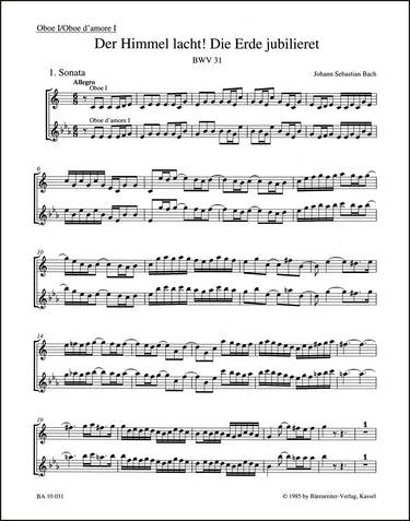 **Title**: The Heavens laugh, the earth exults in gladness BWV 31 | **Subtitle**: Cantata for the 1st Easter Day | **Comments on Version**: Study score = TP 1031 | **Composer / Author**: Bach, Johann Sebastian | **Editor**: Dürr, Alfred | **Edition Type**: Wind set, Urtext edition | **Scoring/ Instrumentation**: Oboe, Trumpets (3), Timpani | **Binding**: Stapled | **Duration**: 00:23:00 | **Weight**: 64.0 g | **Format**: 32,5 x 25,5 cm | **Pages**: 8/2/2/2/2 S. | **Language**: EN | Sample: https://data.baerenreiter.com/NB/BA/BA10031_65_9790006503247_nb_lrg_01.jpg