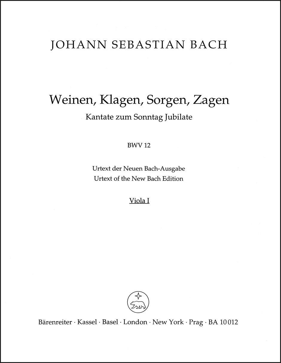 **Title**: Weeping, crying, sorrow, sighing BWV 12 | **Subtitle**: Cantata for the Sunday Jubilate | **Comments on Version**: Study score = TP 1012 | **Composer / Author**: Bach, Johann Sebastian | **Editor**: Emans, Reinmar | **Edition Type**: Part, Urtext edition | **Scoring/ Instrumentation**: 1. Viola | **Binding**: Folded | **Duration**: 00:28:00 | **Weight**: 15.0 g | **Format**: 32,5 x 25,5 cm | **Pages**: 3 S. | **Language**: EN | Sample: https://data.baerenreiter.com/NB/BA/BA10012_79_9790006503124_nb_lrg_01.jpg