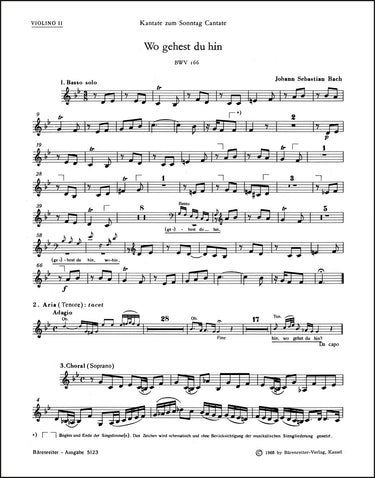 **Title**: Wo gehest du hin? BWV 166 | **Subtitle**: Cantata for the 4th Sunday after Easter | **Composer / Author**: Bach, Johann Sebastian | **Editor**: Dürr, Alfred | **Edition Type**: Part, Urtext edition | **Scoring/ Instrumentation**: 2. Violin | **Binding**: Stapled | **Weight**: 26.0 g | **Format**: 32,5 x 25,5 cm | **Pages**: 6 S. | **Language**: EN | Sample: https://data.baerenreiter.com/NB/BA/BA10166_75_9790006491377_nb_lrg_01.jpg