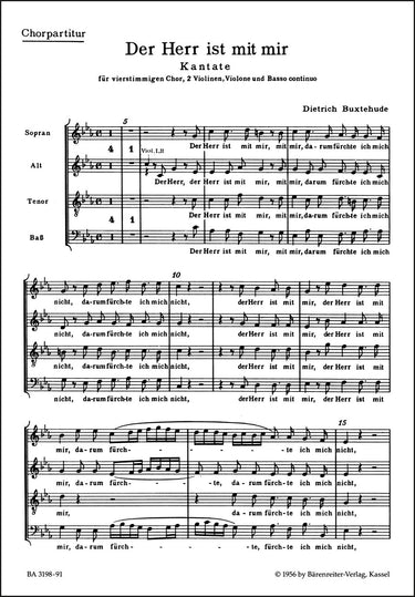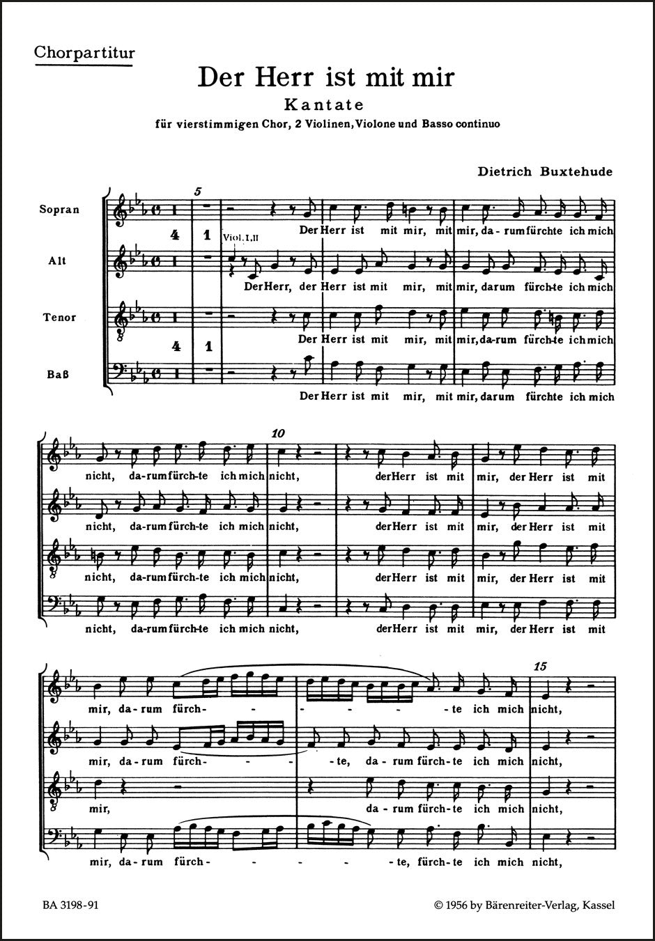 **Title**: Der Herr ist mit mir BuxWV 15 | **Subtitle**: Cantata | **Composer / Author**: Buxtehude, Dietrich | **Editor**: Grusnick, Bruno | **Edition Type**: Choral score | **Scoring/ Instrumentation**: Mixed choir (SATB) | **Binding**: Stapled | **Weight**: 32.0 g | **Format**: 27,0 x 19,0 cm | **Pages**: 11 S. | **Language**: EN | Sample: https://data.baerenreiter.com/NB/BA/BA03198_91_9790006431335_nb_lrg_01.jpg