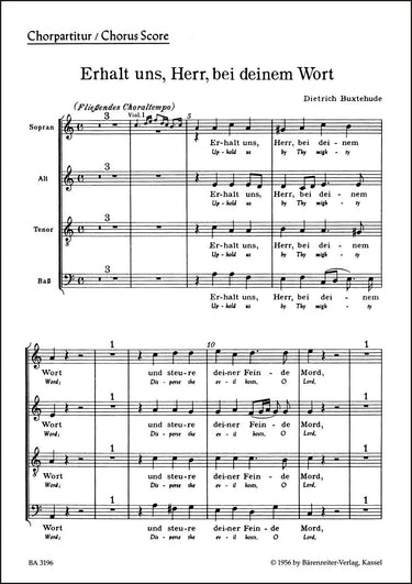 **Title**: Erhalt uns Herr, bei deinem Wort - Uphold us by Thy mighty BuxWV 27 | **Subtitle**: Choralkantate | **Composer / Author**: Buxtehude, Dietrich | **Editor**: Grusnick, Bruno | **Edition Type**: Choral score | **Instrumentation**: Choir, Strings, Basso continuo | **Scoring/ Instrumentation**: Mixed choir (SATB) | **Binding**: Stapled | **Language of Text Part**: German, English | **Weight**: 18.0 g | **Format**: 27,0 x 19,0 cm | **Pages**: 8 S. | **Language**: EN | Sample: https://data.baerenreiter.com/NB/BA/BA03196_91_9790006431250_nb_lrg_01.jpg