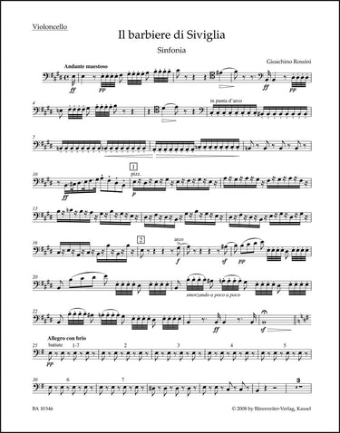 **Title**: Il barbiere di Siviglia (Der Barbier von Sevilla). Sinfonia (Ouverture) | **Composer / Author**: Rossini, Gioachino | **Editor**: Brauner, Patricia B. | **Edition Type**: Part, Urtext edition | **Scoring/ Instrumentation**: Violoncello | **Binding**: Stapled | **Duration**: 00:08:00 | **Weight**: 33.0 g | **Format**: 32,5 x 25,5 cm | **Pages**: 5 S. | **Language**: EN | Sample: https://data.baerenreiter.com/NB/BA/BA10546_82_9790006538324_nb_lrg_01.jpg