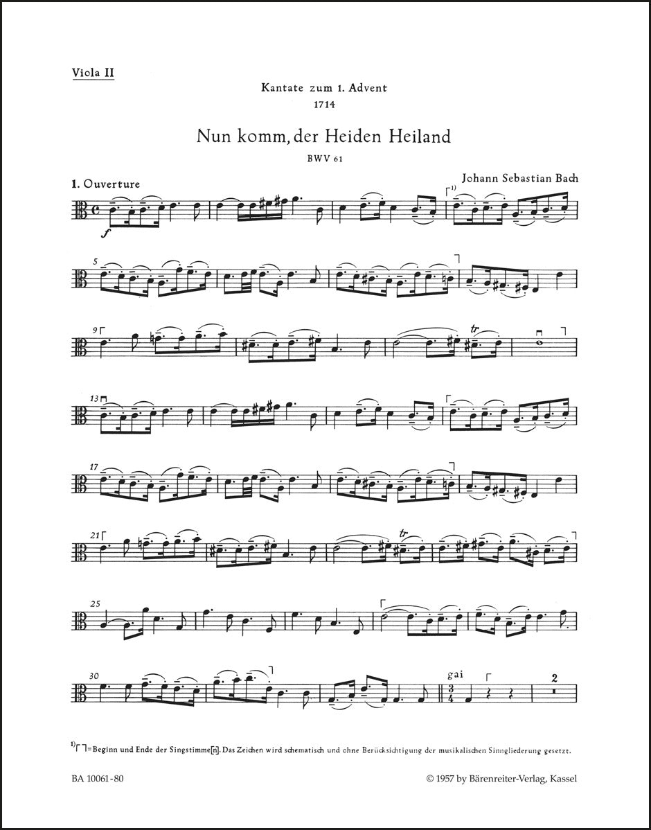 **Title**: Nun komm, der Heiden Heiland BWV 61 | **Subtitle**: Cantata for the First Sunday of Advent | **Comments on Version**: Study score = TP 1061 | **Composer / Author**: Bach, Johann Sebastian | **Editor**: Dürr, Alfred | **Edition Type**: Part, Urtext edition | **Scoring/ Instrumentation**: 2. Viola | **Binding**: Folded | **Weight**: 17.0 g | **Format**: 32,5 x 25,5 cm | **Pages**: 4 S. | **Language**: EN | Sample: https://data.baerenreiter.com/NB/BA/BA10061_80_9790006490295_nb_lrg_01.jpg